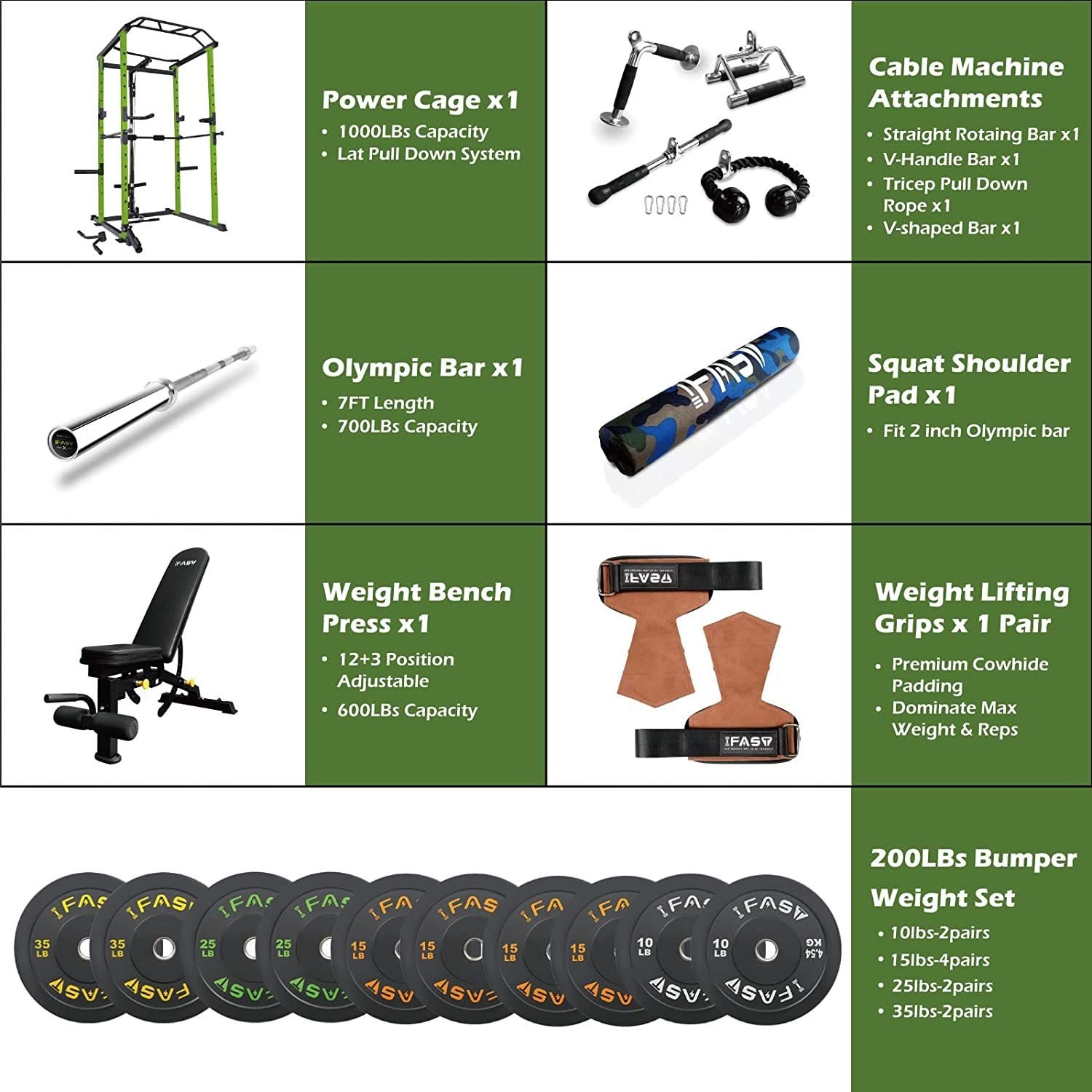 1.Package ListPower Cage with Lat Pull Down System x1; Adjustable Weight Bench x1; 7FT Olympic Barbell x1; 100LBS Olympic Rubber Plates Set (10lbs x2, 15lbs x2, 25lbs x2); Weight Lifting Hook x1 Pair; Squat Shoulder Pad x1; Straight Rotating Bar x1; V-Handle Bar x1; Tricep Pull Down Rope x1; V-Shaped Bar x1.